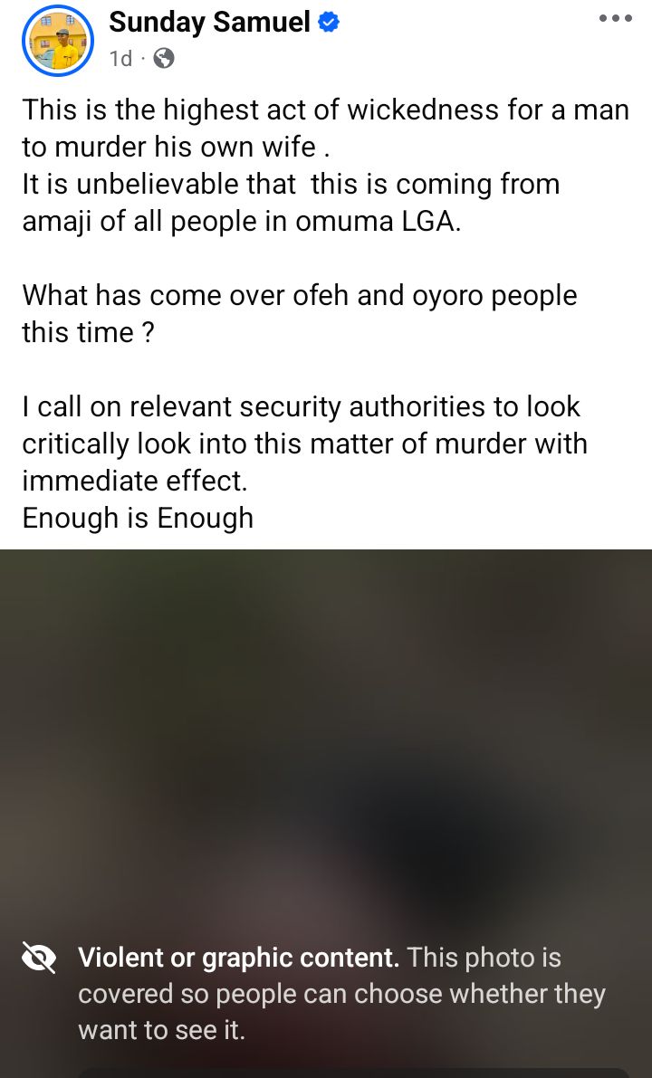 The Rivers State Police Command has arrested a man identified simply as Mr Abuchi for allegedly k!lling his wife in Amaji village, Umuoyoro Community, Omuma Local Government Area of the state. It was gathered that the incident occurred on Thursday, February 19, 2026, when the couple had gone to their farm in Amaji village. A source told punch that an argument ensued between the couple, during which the suspect allegedly used a kitchen knife to slaughter his wife, a mother of two. People got to know about the incident when the woman screamed loudly. The scream attracted other villagers working around the farm. They rushed there, overpowered the man and restrained him, the source said. He added that the incident threw the community into shock and mourning, as residents wondered what could have led to the altercation. A security source, who spoke on condition of anonymity said the suspect reportedly told investigators that he did not know what came over him when the incident occurred. The suspect was subsequently handed over to the Eberi Police Division in Omuma LGA. The spokesperson for the command, Grace Iringe-Koko, confirmed the incident to the publication on Friday. “Yes, I can confirm the incident. The suspect has been arrested and the Commissioner of Police has ordered a detailed investigation to ensure timely justice, she said.