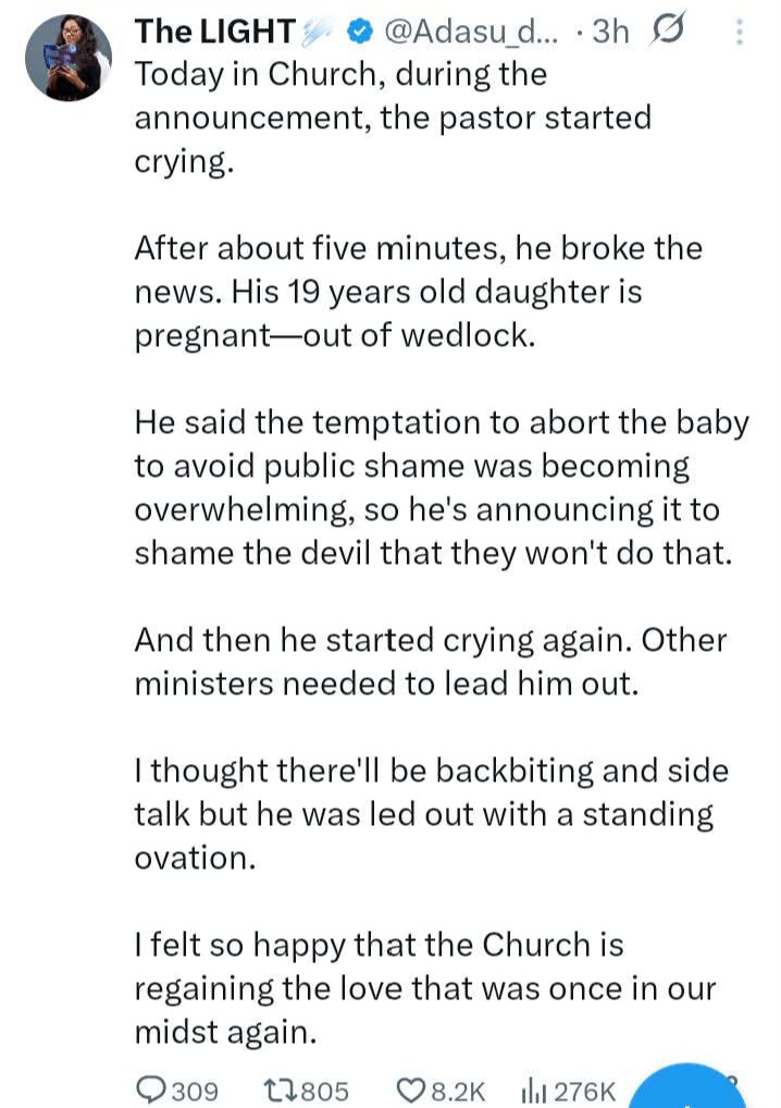 A pastor broke down in church yesterday, Feb. 22, as he announced to his congregation that his unmarried teenage daughter is pregnant. A church member who witnessed the scene narrated this on X. She wrote: “Today in Church, during the announcement, the pastor started crying. “After about five minutes, he broke the news. His 19 years old daughter is pregnantout of wedlock. “He said the temptation to abort the baby to avoid public shame was becoming overwhelming, so he’s announcing it to shame the devil that they won’t do that. “And then he started crying again. Other ministers needed to lead him out. “I thought there’ll be backbiting and side talk but he was led out with a standing ovation. “I felt so happy that the Church is regaining the love that was once in our midst again.” The post Pastor breaks down in tears on the pulpit as he announces his teenage daughter is pregnant out of wedlock appeared first on Linda Ikeji Blog.
