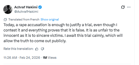 Paris Saint-Germain defender, Achraf Hakimi has publicly broken his silence after a French judge ordered that he stand trial over a rape charge stemming from an allegation made in 2023. The rape charges stemming from an incident alleged to have occurred in February 2023. According to reports, the woman had been in contact with Hakimi via Instagram for about a month before visiting his residence on the night of 24-25 February 2023. She alleged that Hakimi kissed her without consent, touched her inappropriately, and proceeded to rape her despite her protests. She reportedly managed to escape by kicking him and sending a distress message to a friend, who arranged for her transport away from the scene. The complainant filed a report at the Nogent-sur-Marne police station the following day, prompting the Nanterre prosecutor’s office to launch a preliminary investigation on 27 February 2023. Hakimi was questioned by authorities in March 2023 and formally indicted the next day on preliminary rape charges. He was placed under judicial supervision, which included a ban on contacting the alleged victim, but he was not detained and continued his professional career uninterrupted. The 27-year-old Moroccan skipper, who has consistently denied the accusations, confirmed the development via a statement on social media on Tuesday, Feb. 24, expressing confidence that the proceedings would exonerate him. Today, a rape accusation is enough to justify a trial, even though I deny it and everything proves its false, Hakimi said in a post on X. This is as unjust to the innocent as it is to the genuine victims. I calmly await this trial, which will allow the truth to come out publicly.
