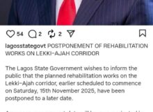 The Lagos State Government (LASG) says the planned rehabilitation works on the LekkiAjah corridor, earlier scheduled to commence on Saturday, Nov. 15, have been postponed to a later