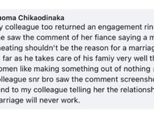 A Nigerian lady, Iruoma Chikaodinaka, has revealed that her colleague called off her engagement after over a Facebook comment. According to Iruoma, the lady took the action after her