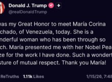 Venezuelan opposition leader Maria Corina Machado says she presented her Nobel Peace Prize medal to U.S. President Donald Trump during a closed-door lunch at the White House on