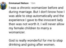A Nigerian man, Emmanuel Nelson, has revealed that he was a chronic womanizer before and during his marriage. He disclosed this on Saturday while reacting to a Facebook post