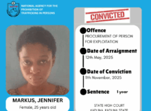 The National Agency for the Prohibition of Trafficking in Persons (NAPTIP) has secured a one year sentence against a 25-year-old woman, Markus Jennifer, for attempting to transport another