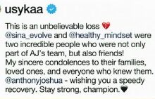 Heavyweight boxing champion, Oleksandr Usyk has sent a heartfelt message to his former rival, Anthony Joshua, following a fatal car crash along the Lagos-Ibadan Expressway. Joshua was reportedly injured