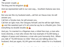 A Nigerian woman, Ekechi Rahamat Chinenyenwa Jaji, who converted to Islam, has hailed her Muslim husband, Barrister Muhammad Jaji, describing him as a detribalised Nigerian. Ekechi, from Enugu State,