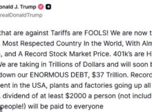 US President Donald Trump has announced that each American will receive at least $2,000 from U.S. tariff revenues. In a post on Truth Social, Trump noted that the payments would