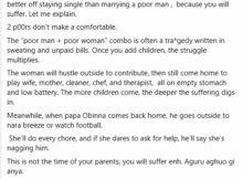 Media personality, Chioma Ahaghotu, has said that a poor Nigerian woman living in Nigeria has no business marrying a poor man. Ahaghotu, who stated this in a Facebook post