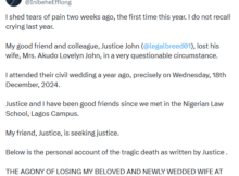 Human Rights lawyer, Inibehe Effiong, has taken to social media to demand justice for his friends wife who passed away in a Lagos hospital from alleged medical negligence
