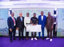 Divisional Head, Agribusiness and Non-Oil Exports, First City Monument Bank (FCMB), Mr. Kudzai Gumunyu, presenting a cheque to Favour Adeleke of Qiqi Farms, the grand prize winner of