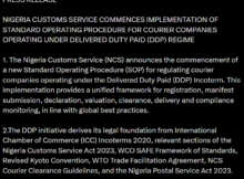 he Nigeria Customs Service (NCS) has commenced the implementation of a new Standard Operating Procedure (SOP) for courier companies operating under the Delivered Duty Paid (DDP) Incoterm. According to