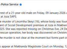 A 21-year-old man has been arrested after handing himself over to police in connection with the m8rder of a 16-year-old girl whose body was discovered in Joza, Makhanda,