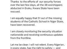 The 38 members of the Christ Apostolic Church in Eruku community in Kwara state who were abducted by bandits on Tuesday, November 18, have reganed their freedom. President Tinubu