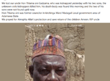 Suspected Boko Haram terrorists launched an attack on Kirchinga, Madagali Local Government Area of Adamawa State, k!lling a former councillor and abducting his two sons. The victim, Hon. Thlama