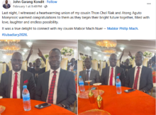 A South Sudanese man, Thon Chol Riak, has married his bride, Atong Aguto Monyroor in a lavish wedding ceremony after a stiff competition from a rival. The high profile