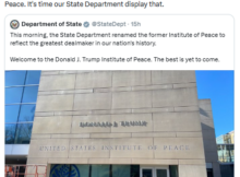 President Donald Trumps administration has rebranded the U.S. Institute of Peace to include his own name after seizing control of the agency and slashing its funding. On Wednesday, Dec.