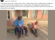 The Abia State Police Command has arrested one Uchechukwu Uchegbu, for k!lling his father, Emmanuel Uchegbu, over a long-standing property dispute. The incident occurred in Elugwu Nkata community in
