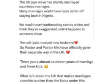 A Nigerian lawyer in the UK, Bolanle Cole, the UK japa wave has silently destroyed countless marriages. Cole stated this on his X handle after a Nigerian cleric