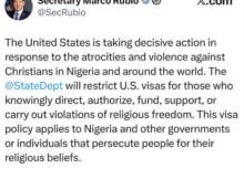 The United States has announced new visa restrictions targeting Nigerians accused of undermining religious freedom. The Secretary of State, Marco Rubio, disclosed this on X this evening December 3.