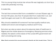 The last time someone d!ed from a snakebite in the UK was 50years ago- Nigerian doctor reacts in shock to de@th of Nigerian upcoming singer by snakebitePopular Nigerian
