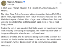The spokesperson of the Niger State Police Command, Wasiu Abiodun, has confirmed the d3ath of a 53-year-old lecturer, Abdulfatai Aiyede, in a young woman’s house in Minna. LIB reported