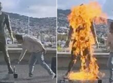 Police in Portugal are hunting a vandal who set light to a Cristiano Ronaldo statue on the footballers home island of Madeira and shared the video online. The man filmed himself