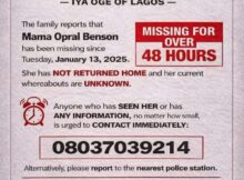 The family of Opral Benson, the Iya Oge of Lagos, has declared her missing. In a notice released on Sunday, the family revealed Benson,90, was last seen on January