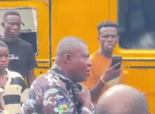 A group of angry Nigerians confronted a police officer over alleged theft. A video circulating online shows the confrontation taking place along a busy road. The video shows a