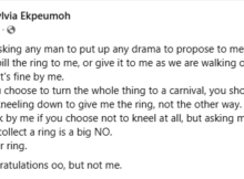A Nigerian lady, Sylvia Ekpeumoh, has said she would rather her man waybills an engagement ring to her than make her kneel to accept his proposal. She stated this