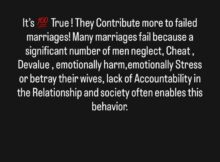 Actress Uche Ogbodo has given her reasons for saying men are 95% of the time responsible for failed marriages. Recall that on Tuesday, February 10, she made a post
