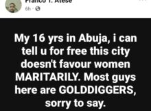 A social media user, Franco Atese, has declared that Abuja doesn’t favour women in terms of marriage. Atese, who has lived in Abuja for 16 years, also stated that