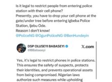 The spokesperson of the Ogun state police command, DSP Oluseyi Babaseyu, says the police has constitutional powers to enforce restriction of mobile phones within police stations. According to him,