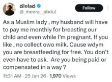 A Nigerian woman, Meerah Abdul, has said she won’t breastfeed her child for free. According to Meerah, her husband will have to pay her monthly to breastfeed their child. As