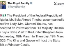 President Bola Tinubu and First Lady, Senator Oluremi Tinubu, will pay a state visit to the United Kingdom from Wednesday, March 18 to Thursday, March 19, 2026. The announcement