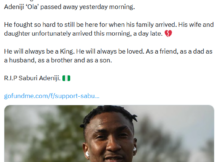 A Nigerian footballer, Saburi Olayinka Adeniji, has d!ed after battling a severe brain stem injury in the United Kingdom. The left winger for Kings Park Rangers Football Club, passed